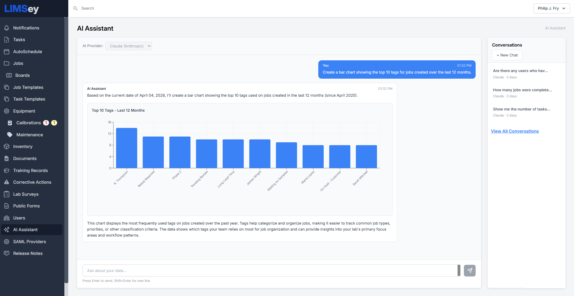LIMSey’s built-in AI Assistant connects directly to your lab data. Ask questions in plain English and get instant answers, charts, and tables without pulling a single report. Ask how many jobs were completed last month, which technician has the highest throughput, or where your bottlenecks are. It can also answer general lab and testing questions, making it a knowledgeable resource for your whole team.