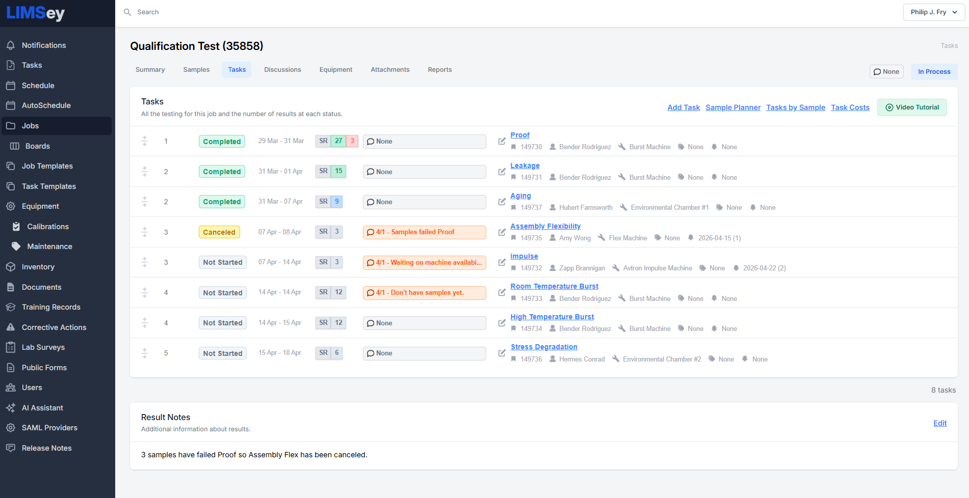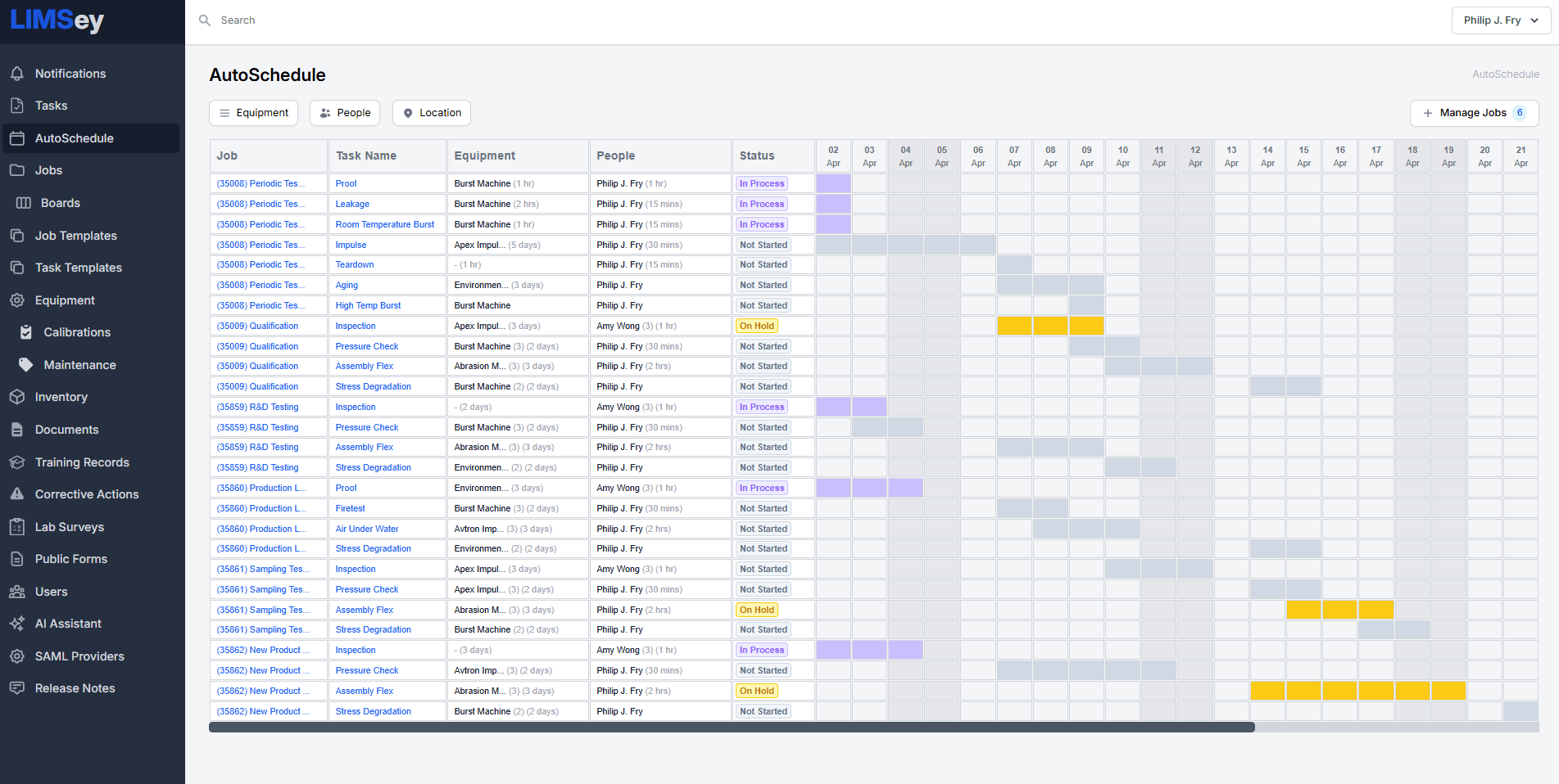 Tell LIMSey what equipment and people are capable of each task, how long each step takes, and which jobs are highest priority. The AutoScheduler handles the rest — assigning the soonest available resources to each task and automatically reshuffling the schedule when something runs long, finishes early, or availability changes.