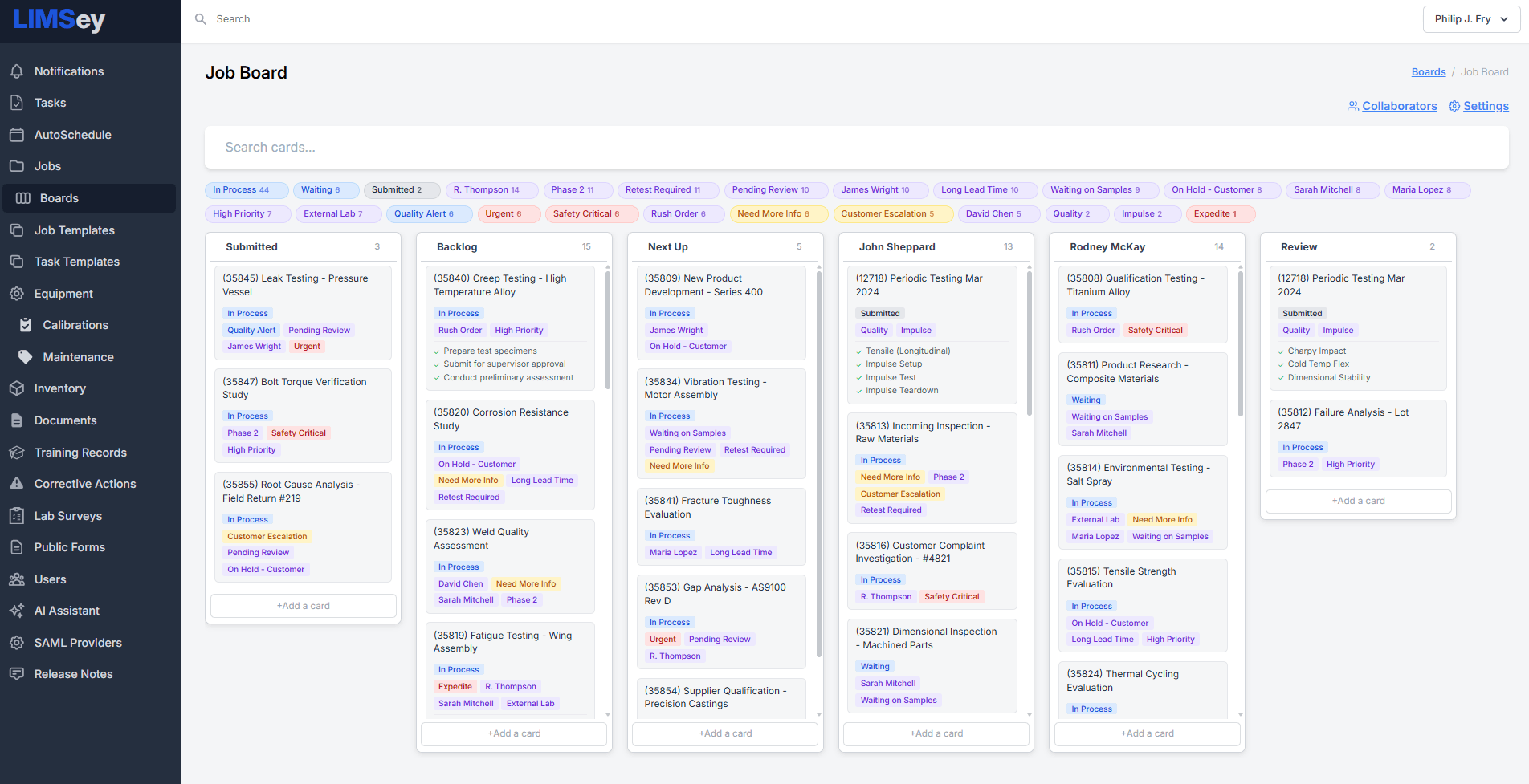 LIMSey is the LIMS built for engineering and manufacturing testing labs — track every job, sample, and test from submission to final report.
