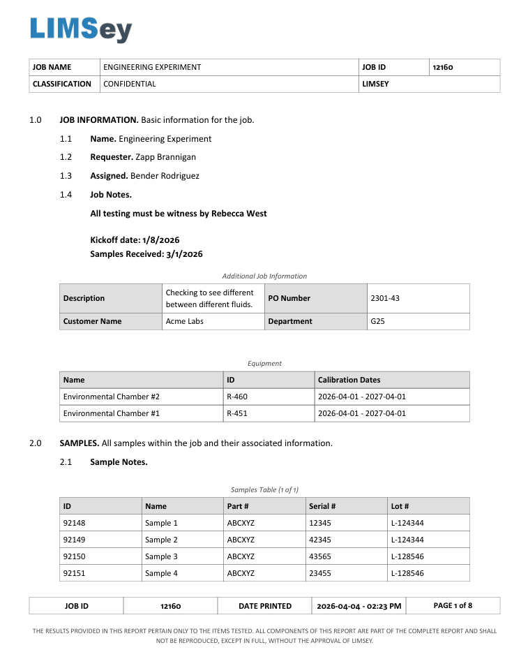 Build your report template once — define your sections, tables, and layout, then use data templates to automatically pull in samples, test results, images, and attachments from the job. When a job is done, generate a professional PDF or Excel report in one click. No copying, no pasting, no reformatting.